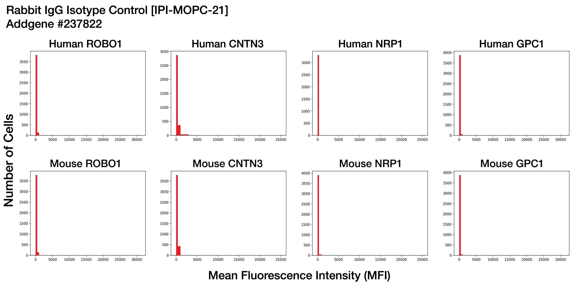 - Experimental results for Rabbit IgG Isotype Control [IPI-MOPC-21] (Addgene #237822) in an immunofluorescence (IF) specificity assay with ExpiCHO cells expressing human or mouse V5-tagged ROBO1, CNTN3, NRP1, or GPC1.