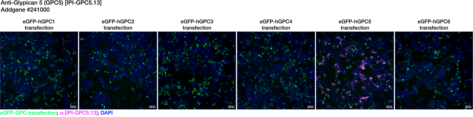 - Experimental results for Anti-Glypican 5 (GPC5) [IPI-GPC5.13] (Addgene #241000) in an immunofluorescence (IF) assay with HEK293T GPC(1–6)KO cells expressing human GPC1, 2, 3, 4, 5 or 6.