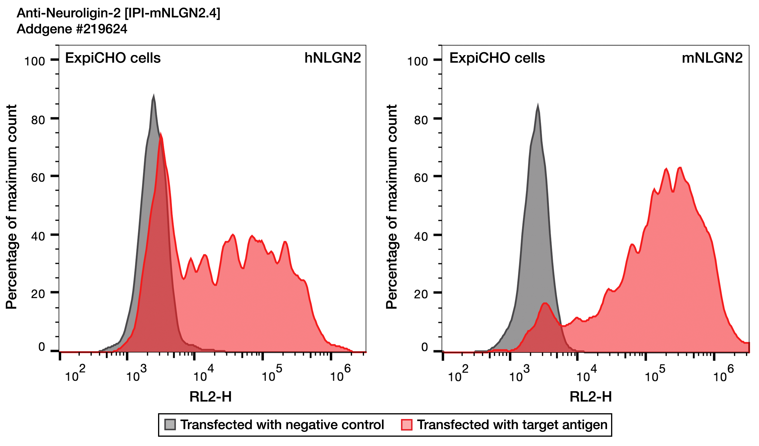 - Experimental results for Anti-Neuroligin-2 [IPI-mNLGN2.4] (Addgene #219624) in a flow cytometry assay with ExpiCHO cells expressing human or mouse NLGN2.