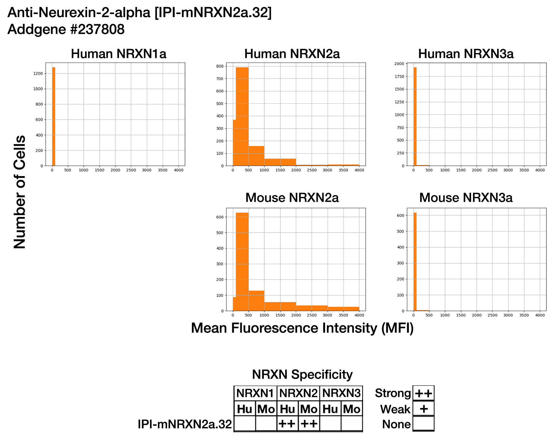 - Experimental results for Anti-Neurexin-2-alpha [IPI-mNRXN2a.32] (Addgene #237808) in an immunofluorescence (IF) specificity assay with ExpiCHO cells expressing human or mouse NRXNs.
