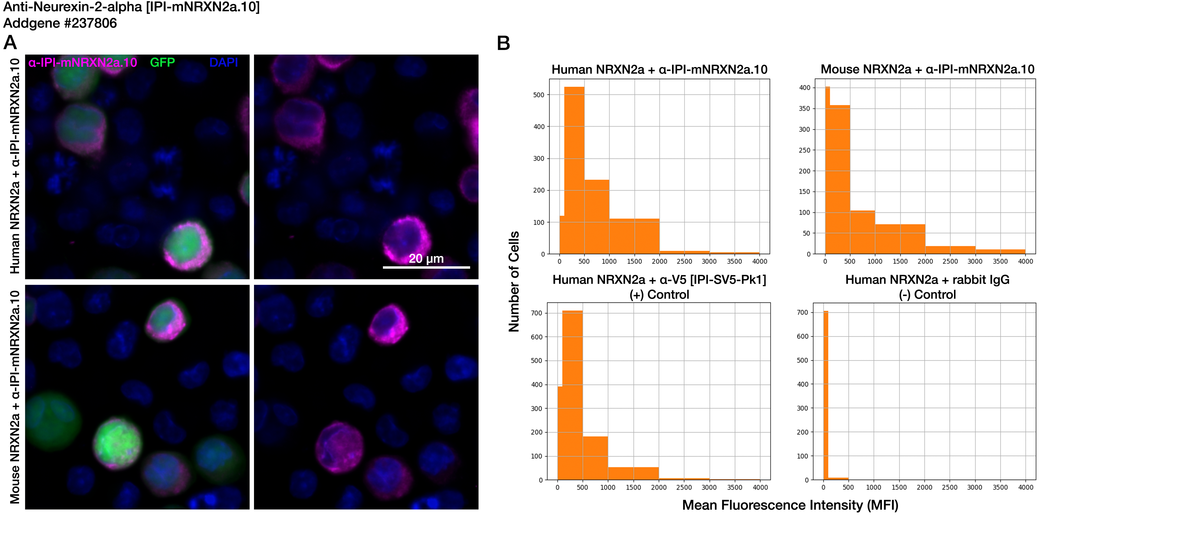 - Experimental results for Anti-Neurexin-2-alpha [IPI-mNRXN2a.10] (Addgene #237806) in an immunofluorescence (IF) binding assay with ExpiCHO cells expressing human or mouse NRXN2a.