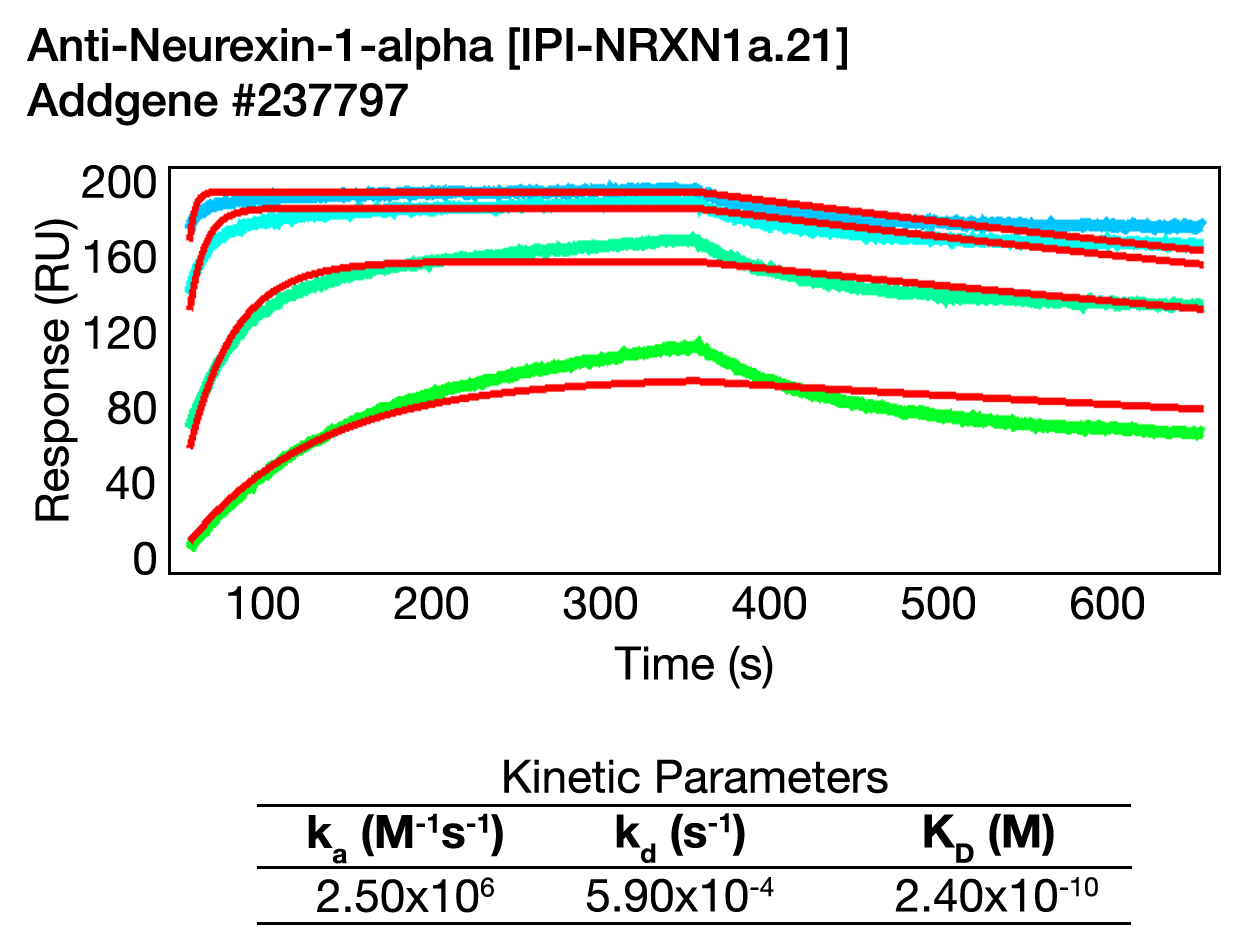 Anti-Neurexin-1-alpha [IPI-NRXN1a.21] in Surface Plasmon Resonance (SPR). Anuganti M, Kachare A, Riedel T, Moshinsky D 2026. Addgene Report, https://doi.org/10.57733/addgene.7was7f