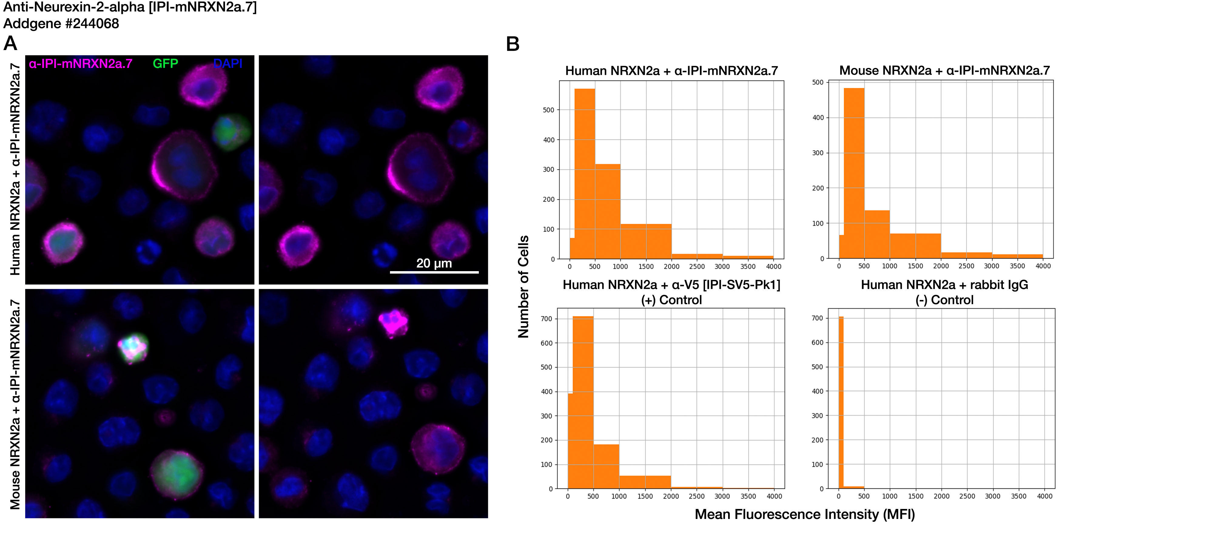 - Experimental results for Anti-Neurexin-2-alpha [IPI-mNRXN2a.7] (Addgene #244068) in an immunofluorescence (IF) binding assay with ExpiCHO cells expressing human or mouse NRXN2a.