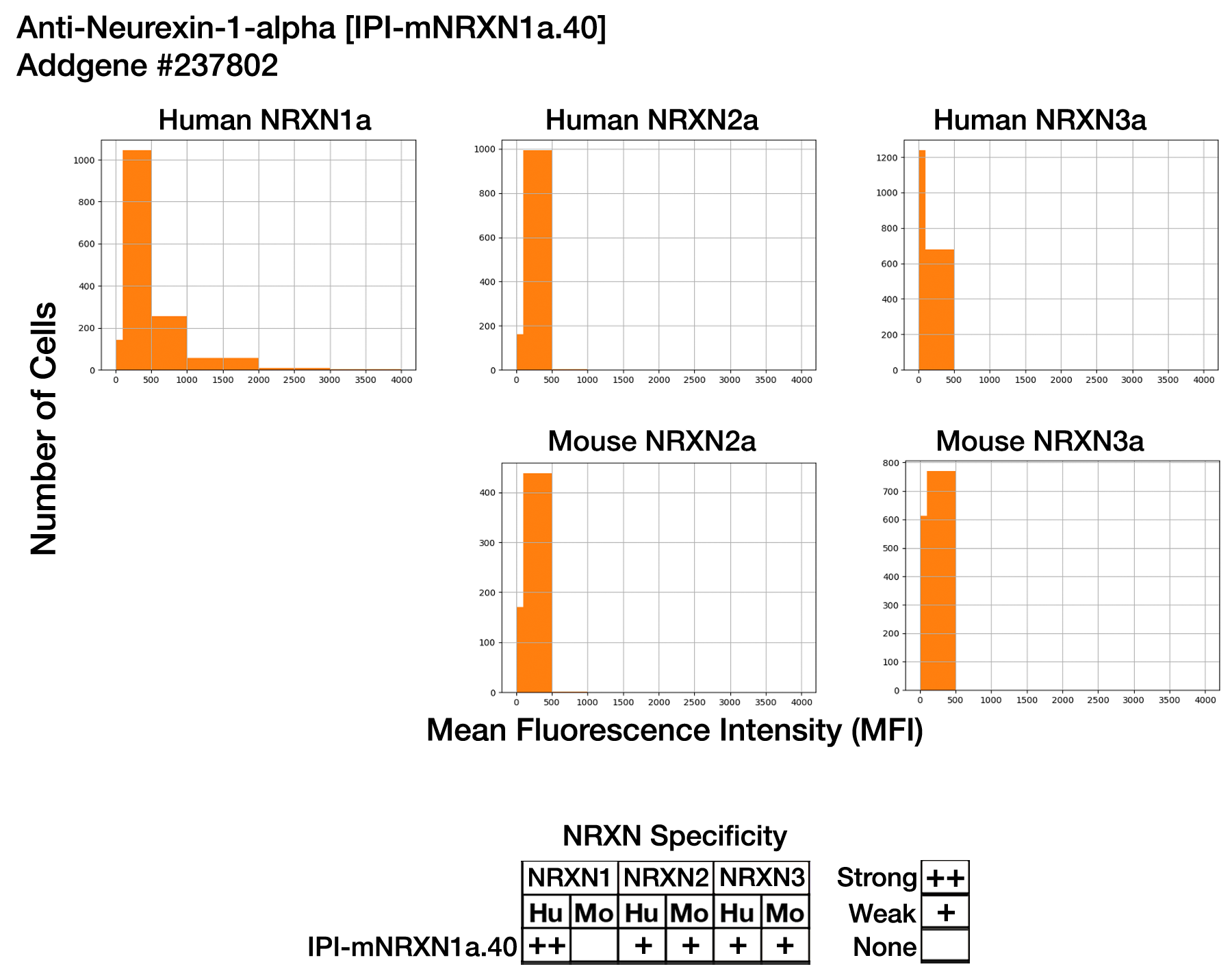 - Experimental results for Anti-Neurexin-1-alpha [IPI-mNRXN1a.40] (Addgene #237802) in an immunofluorescence (IF) specificity assay with ExpiCHO cells expressing human or mouse NRXNs.