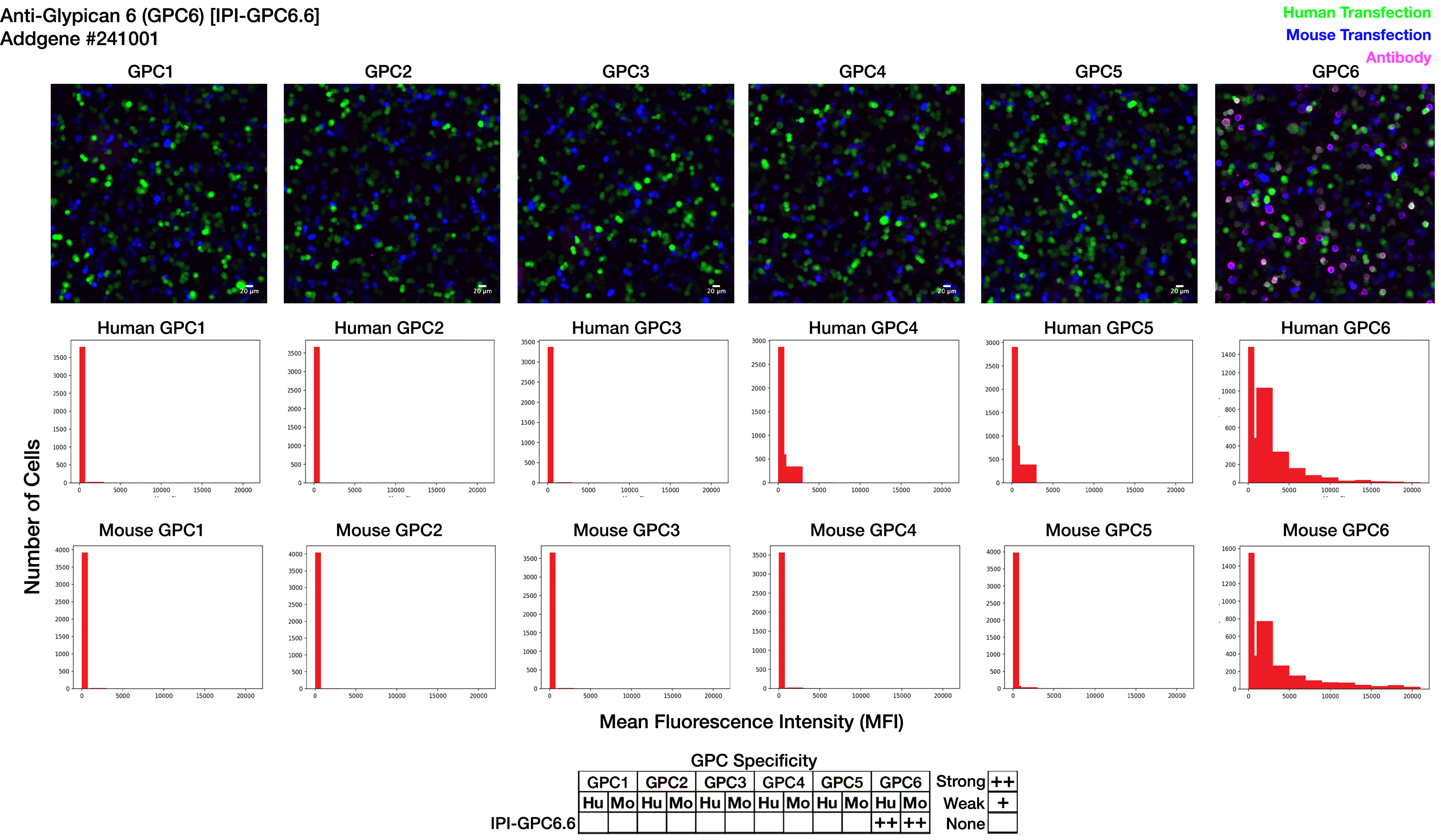 - Experimental results for Anti-Glypican 6 (GPC6) [IPI-GPC6.6] (Addgene #241001) in an immunofluorescence (IF) specificity assay with ExpiCHO cells expressing human and mouse GPCs.