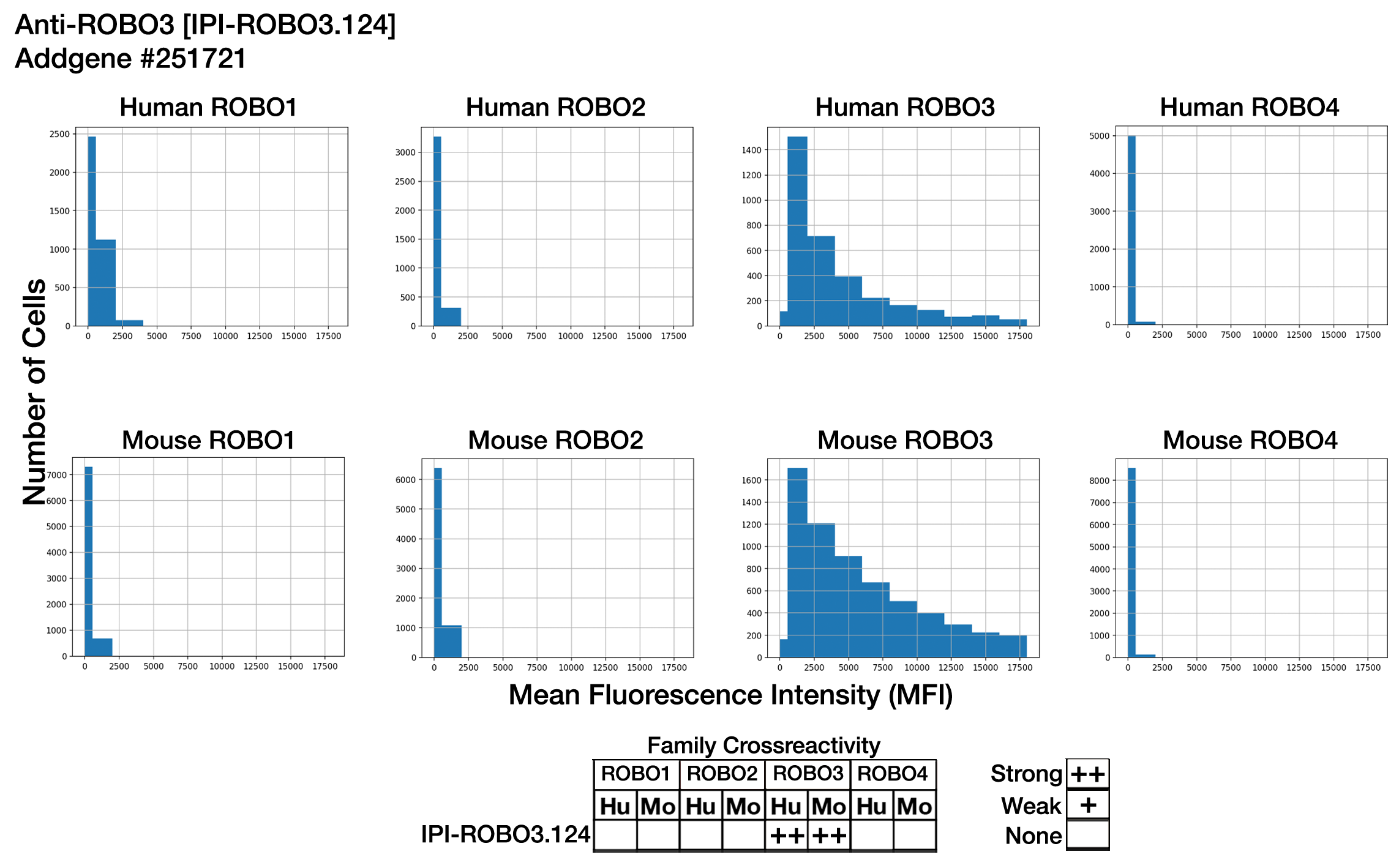 GFP- or BFP- positive cells were identified via the neural network CellPose, then the mean fluorescence intensity (MFI) of the far-red channel for each cell, representing Anti-ROBO3 [IPI-ROBO3.124] labeling, was recorded. Each histogram displays the number of cells with MFIs ranging from below 100 (background fluorescence) to 22000 (saturation).