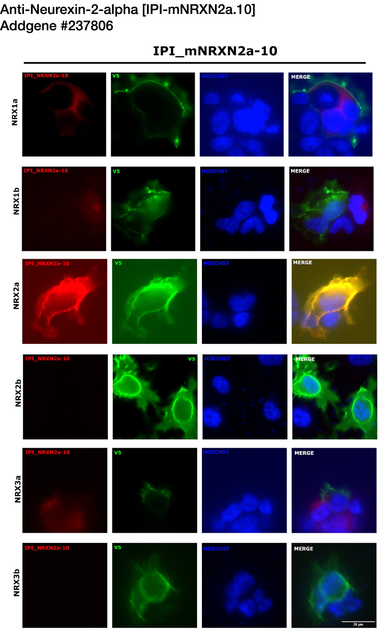 - HEK293T cell cultures expressing V5-tagged NRXN isoforms labeled with Anti-Neurexin-2-alpha [IPI-mNRXN2a.10] (Addgene #237806), Anti-V5, and Hoechst. IPI-mNRXN2a.10 was tested in cells expressing alpha and beta isoforms of mouse NRXN1, NRXN2, and NRXN3.