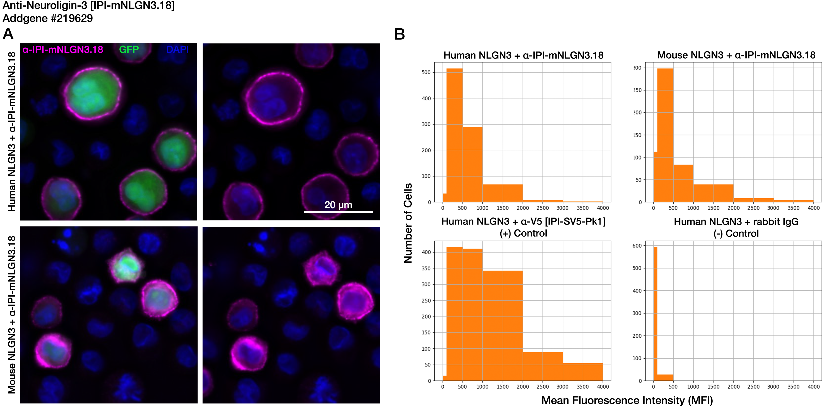 - Experimental results for Anti-Neuroligin-3 [IPI-mNLGN3.18] (Addgene #219629) in an immunofluorescence (IF) binding assay with ExpiCHO cells expressing V5-tagged mouse or human NLGN3.