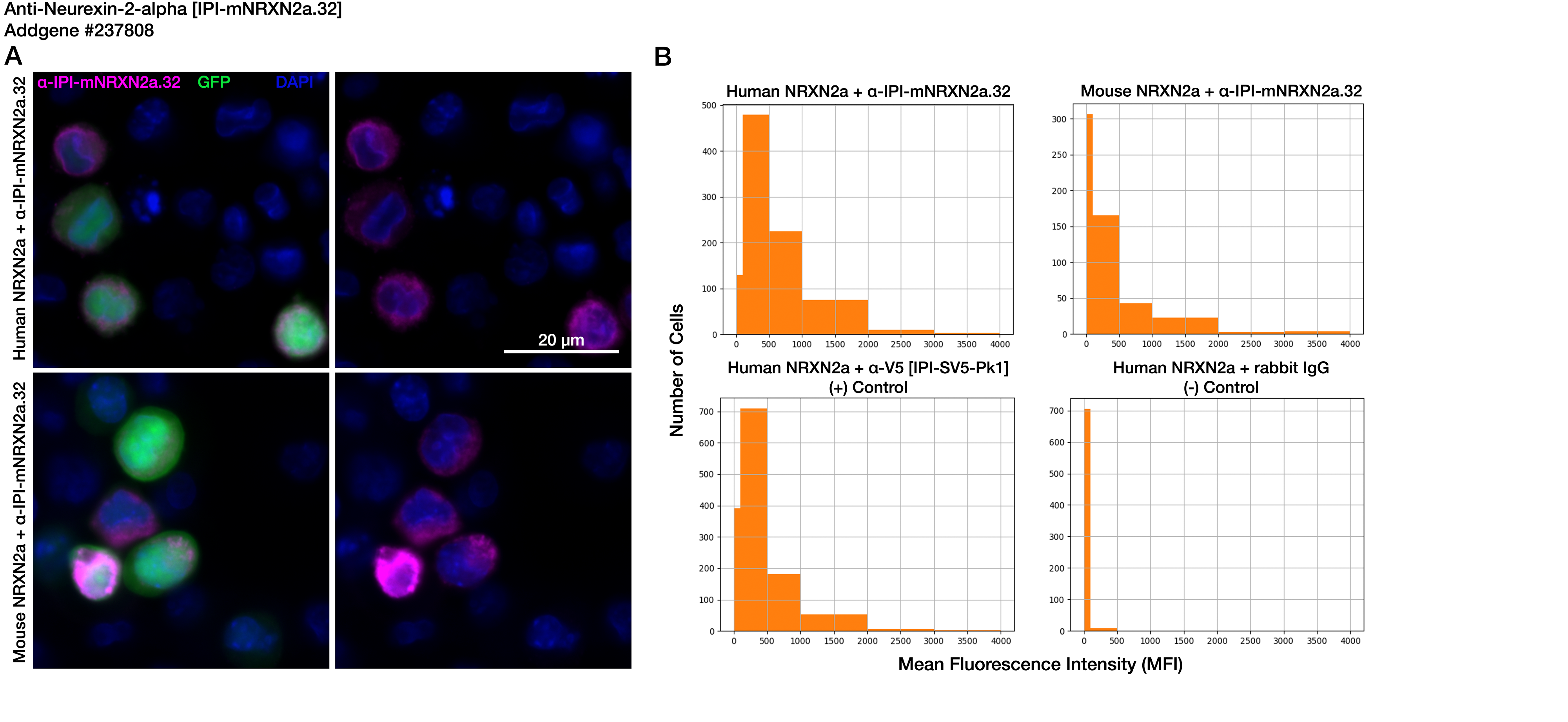 - Experimental results for Anti-Neurexin-2-alpha [IPI-mNRXN2a.32] (Addgene #237808) in an immunofluorescence (IF) binding assay with ExpiCHO cells expressing human or mouse NRXN2a.