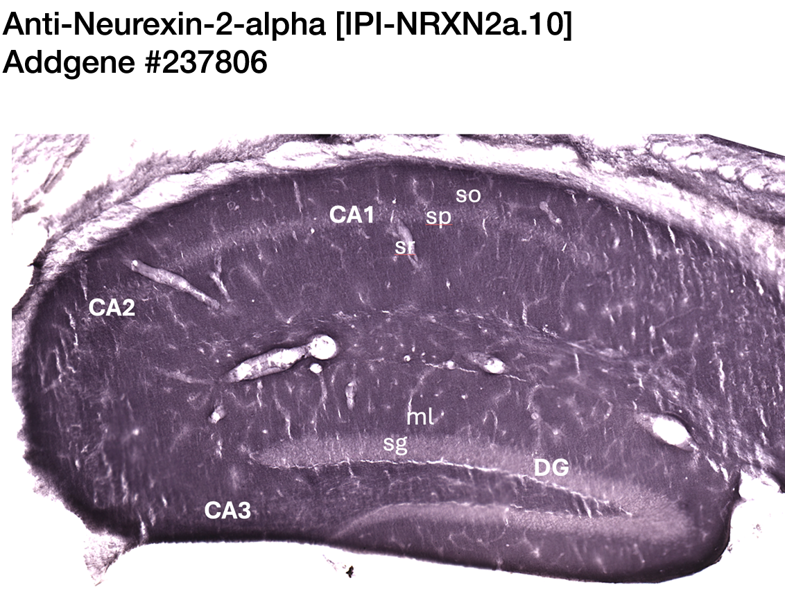 Anti-Neurexin-2-alpha [IPI-mNRXN2a.10] in Immunohistochemistry (mouse). Murray K 2026. Addgene Report, https://doi.org/10.57733/addgene.hnmfin