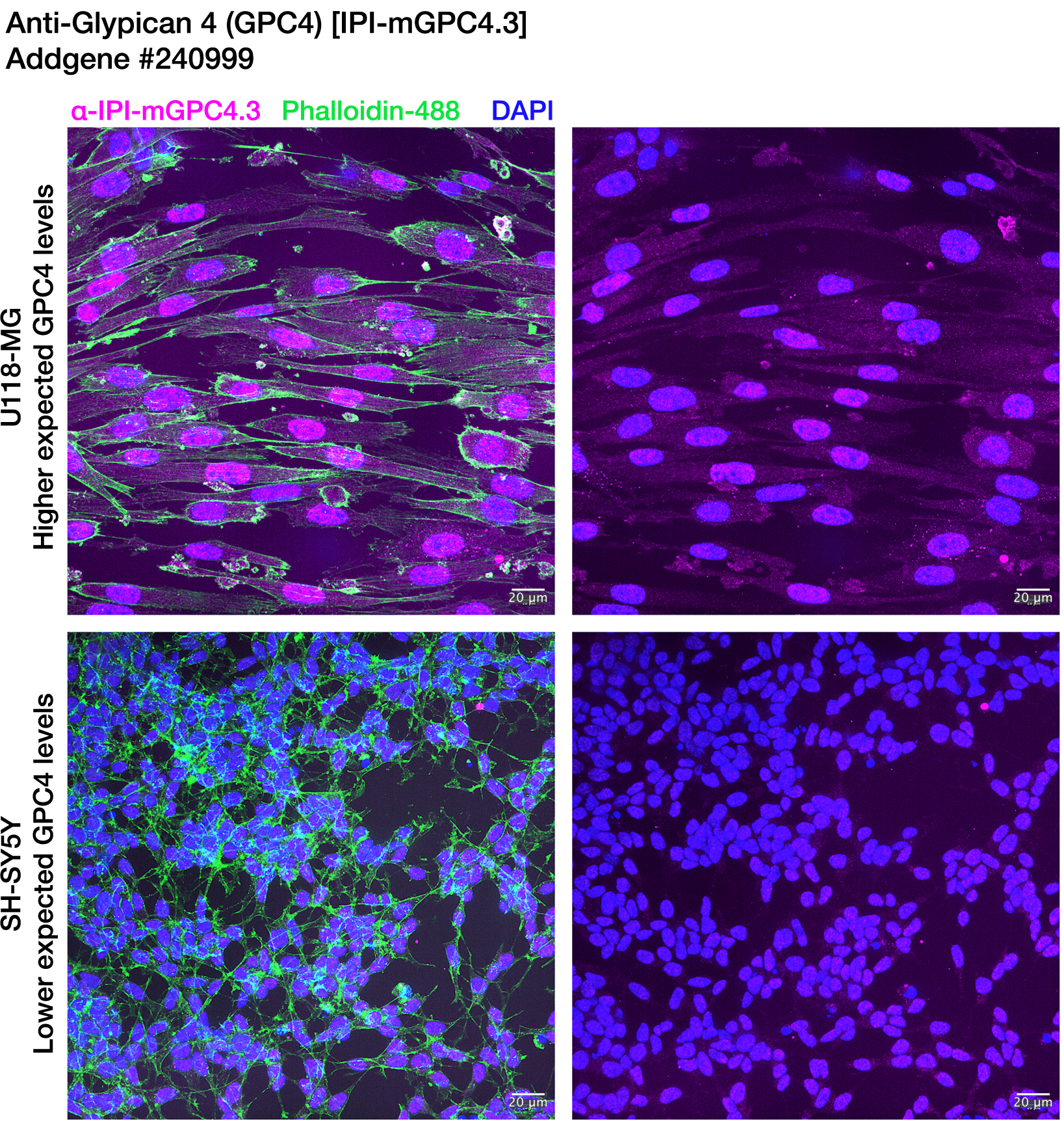 - Experimental results for Anti-Glypican 4 (GPC4) [IPI-mGPC4.3] (Addgene #240999) in an immunofluorescence (IF) endogenous assay with human glioblastoma (U-188 MG) and neuroblastoma (SH-SY5Y) cell lines.
