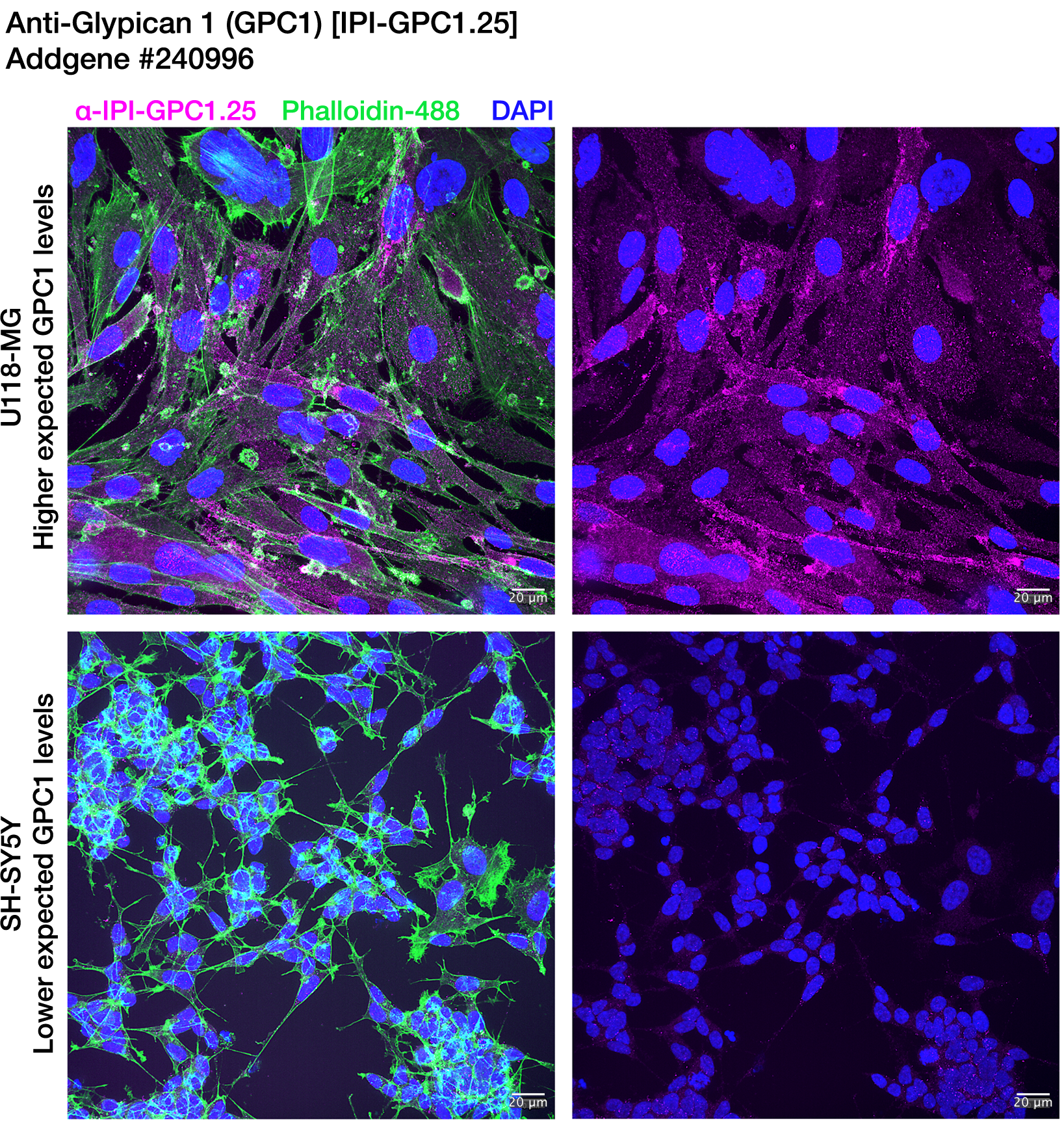 - Experimental results for Anti-Glypican 1 (GPC1) [IPI-GPC1.25] (Addgene #240996) in an immunofluorescence (IF) endogenous assay with human glioblastoma (U-188 MG) and neuroblastoma (SH-SY5Y) cell lines.