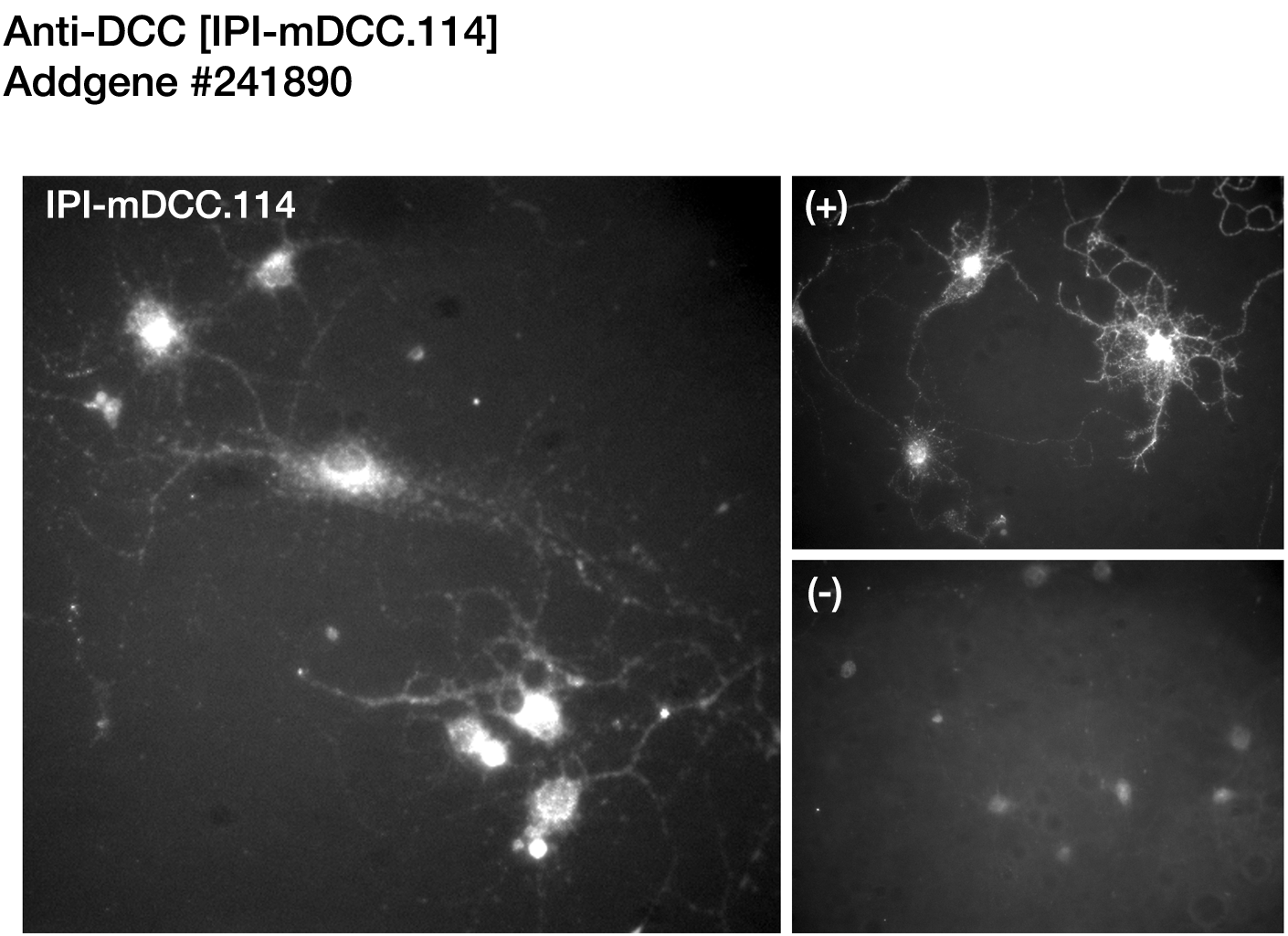 - Experimental results for Anti-DCC [IPI-mDCC.114] (Addgene #241890) in an immunocytochemistry (ICC) assay with rat cortical neurons.