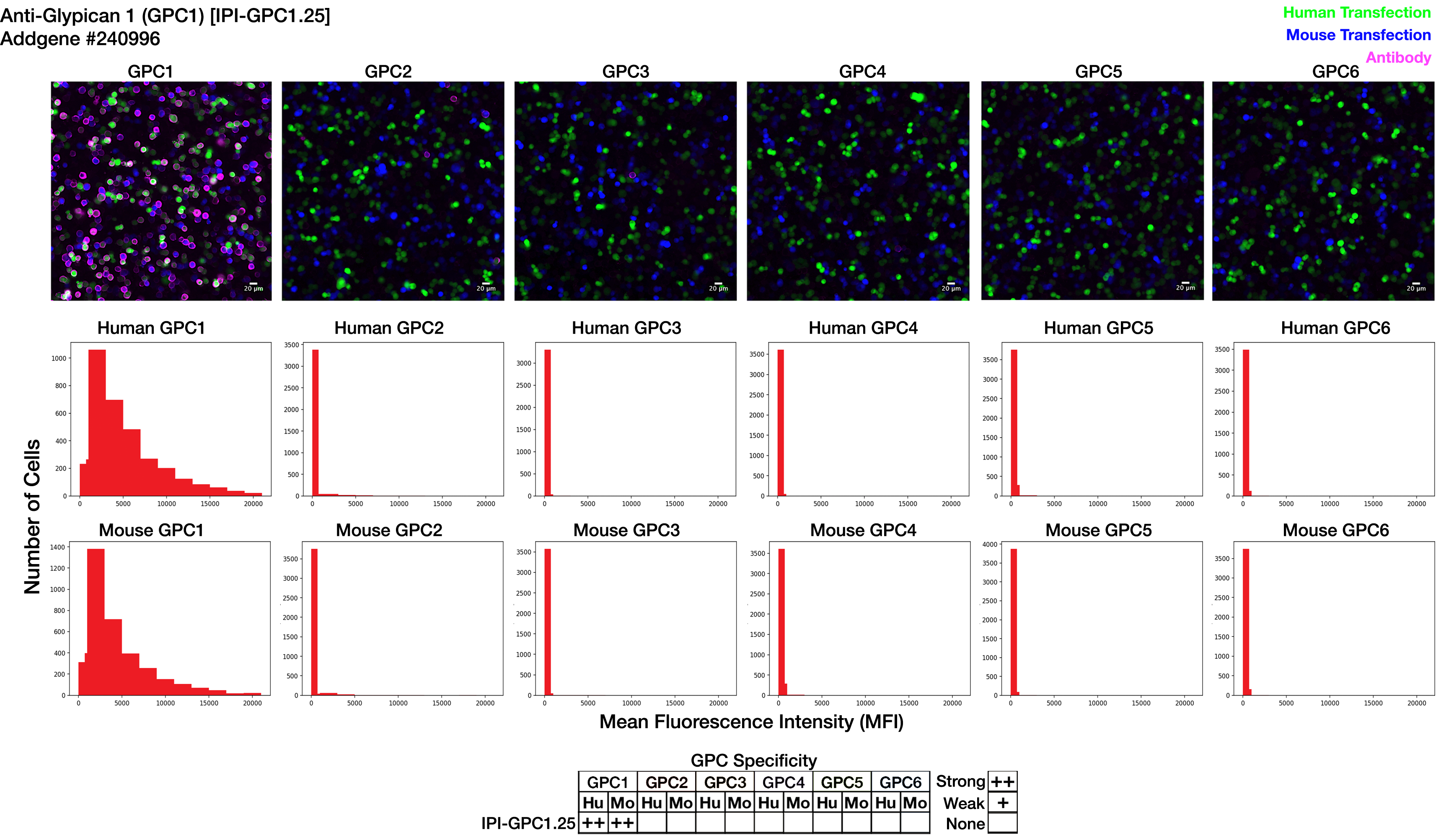 Widefield 10X magnification for quantitative data. GFP- or BFP-positive cells were identified using a custom module in the IN Carta image analysis software, then the mean fluorescence intensity (MFI) of the far-red channel for each cell, representing Anti-Glypican 1 (GPC1) [IPI-GPC1.25] labeling, was recorded. Each histogram displays the number of cells with MFIs ranging from below 450 (background fluorescence) to 20000.