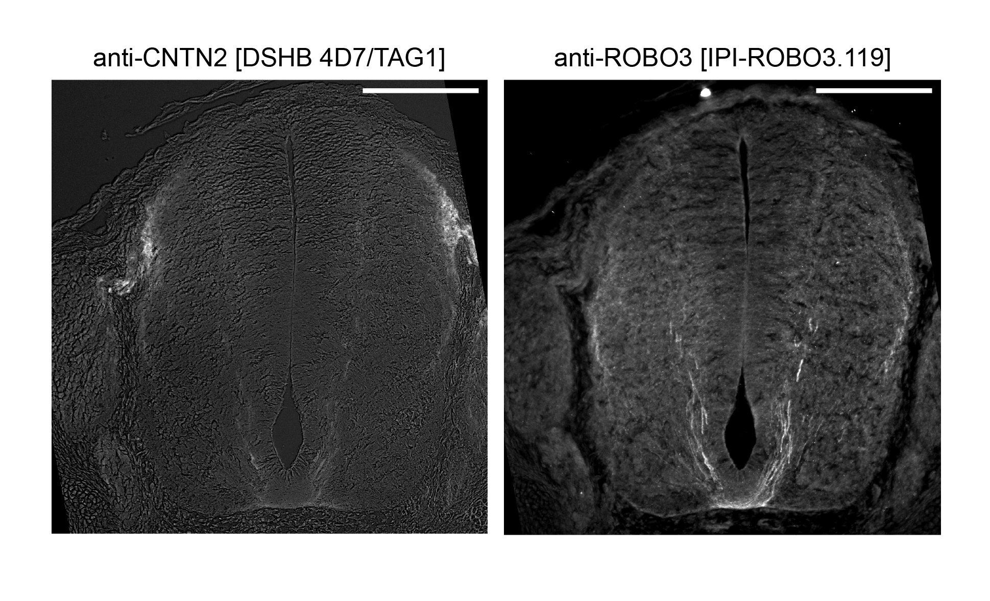 - Experimental results for Anti-ROBO3 [IPI-ROBO3.119] (Addgene #251720) in an immunohistochemistry (IHC) assay with a mouse embryonic spinal cord frozen tissue section.