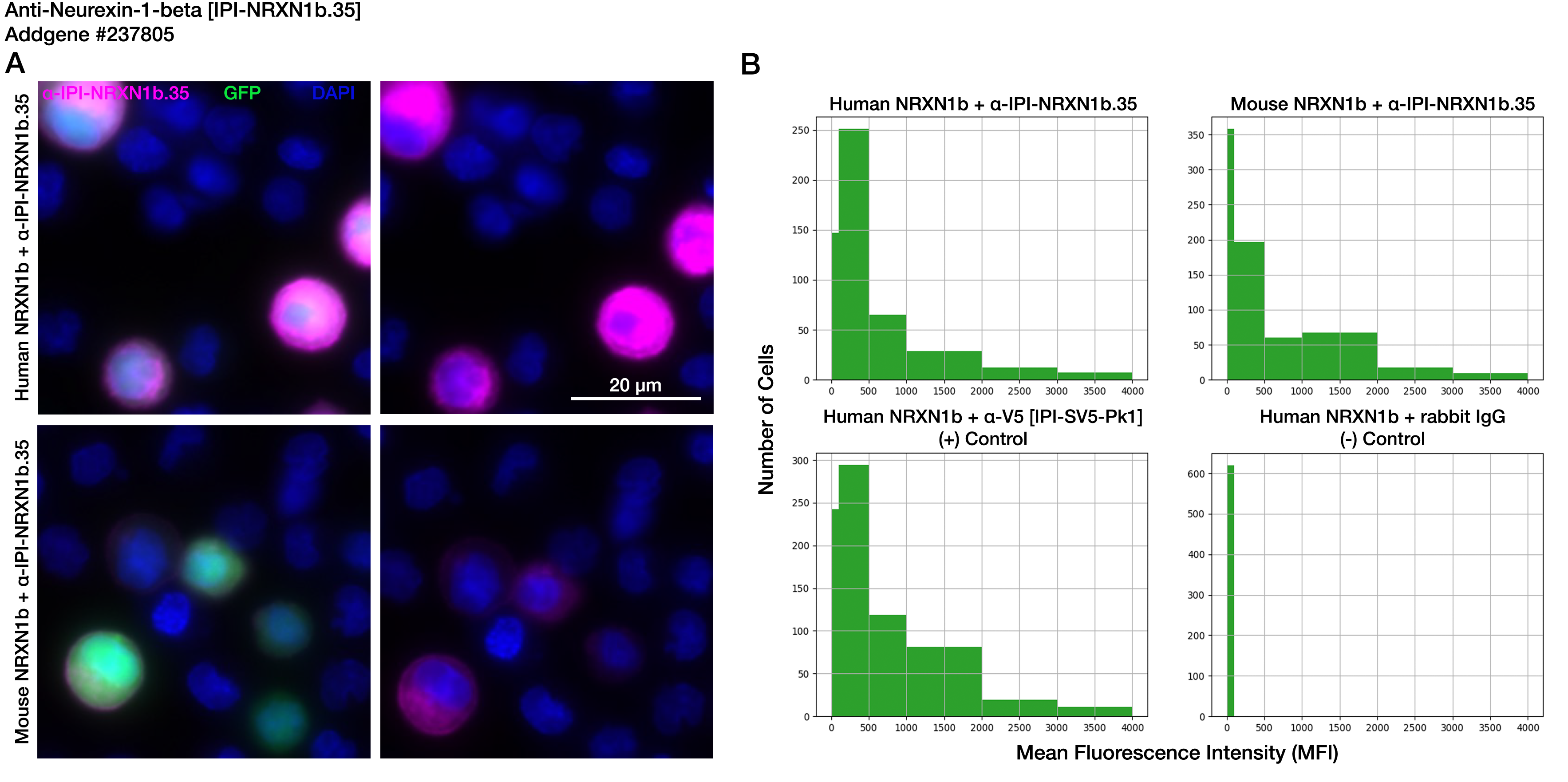 - Experimental results for Anti-Neurexin-1-beta [IPI-NRXN1b.35] (Addgene #237805) in an immunofluorescence (IF) binding assay with ExpiCHO cells expressing V5-tagged human or mouse NRXN1b.