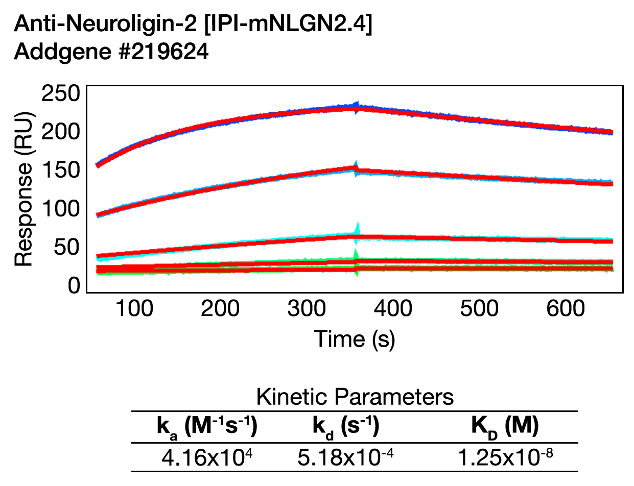 Anti-Neuroligin-2 [IPI-mNLGN2.4] in Surface Plasmon Resonance (SPR). Anuganti M, Kachare A, Riedel T, Moshinsky D 2026. Addgene Report, https://doi.org/10.57733/addgene.rkk41b