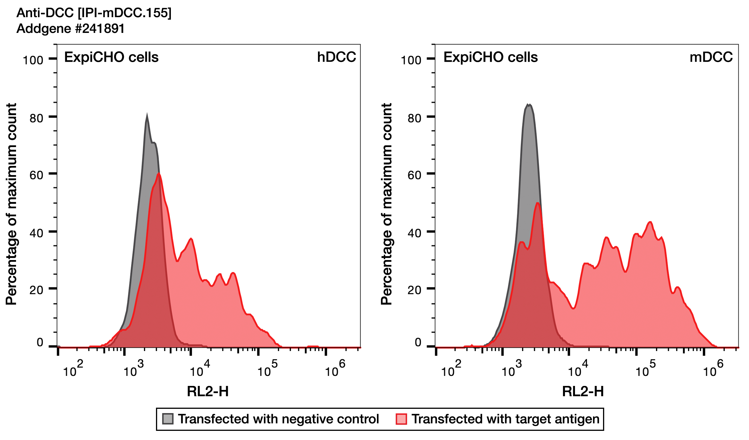 - Experimental results for Anti-DCC [IPI-mDCC.155] (Addgene #241891) in a flow cytometry assay with ExpiCHO cells expressing human or mouse DCC.