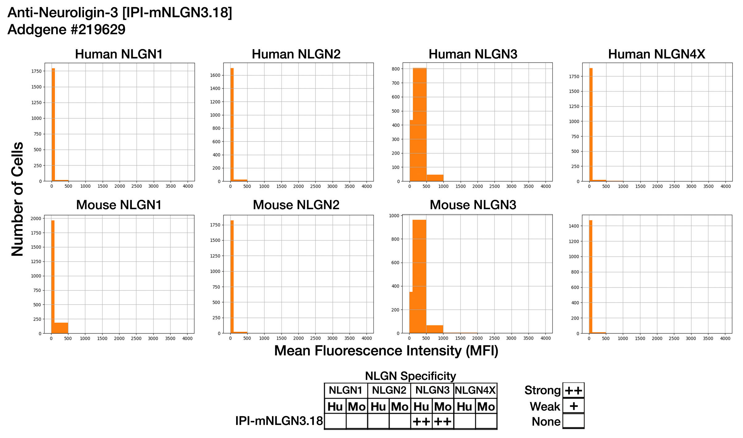 - Experimental results for Anti-Neuroligin-3 [IPI-mNLGN3.18] (Addgene #219629) in an immunofluorescence (IF) specificity assay with ExpiCHO cells expressing human and mouse NLGNs.